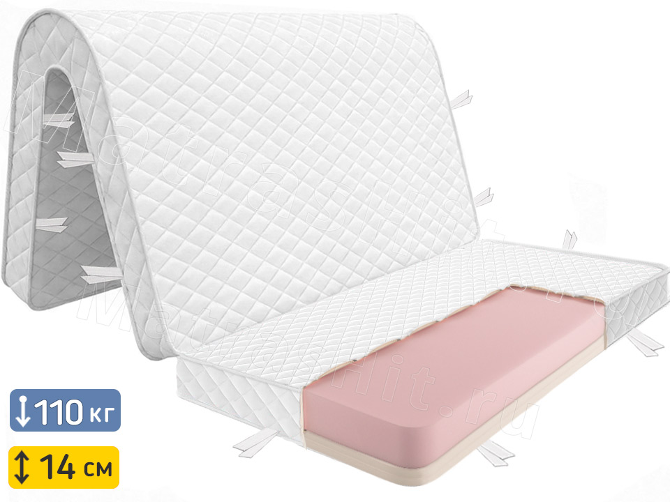 Верхний слой из плотной, упругой пены (10 см) отлично держит вес до 110 кг на одно спальное место (для двуспальных 110 + 110) и предотвращает эффект «гамака». Нижний слой из эластичной пены (4 см), обеспечивает правильное складывание матраса внутри механизма.